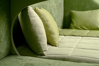 Детали интерьера бережно, но ненавязчиво напоминают о том,что герои любят спорт (через волнообразную, плавную геометрию интерьера – отсыл к волнам или элементы интерьера в виде подушек-шаров, круглых ножек прикроватных тумб или пуфика перед кроватью, напоминающих про футбол)