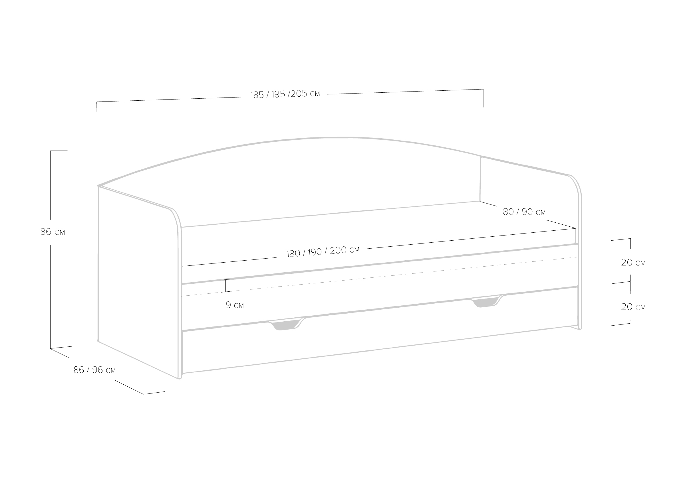 Модуль можно использовать как дополнительное спальное место или вместительный бельевой ящик. Выдвигается полностью для обеспечения уборки под кроватью.