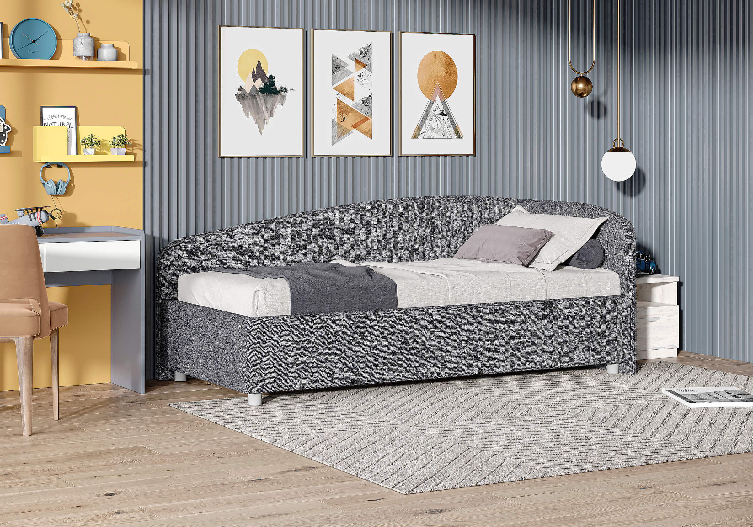 Односпальная кровать для ребенка или подростка. Модель изготовлена из ДСП. При необходимости кровать может быть укомплектована разборным или неразборным металлическим основанием с ламелями, подъемным механизмом с бельевым ящиком.
