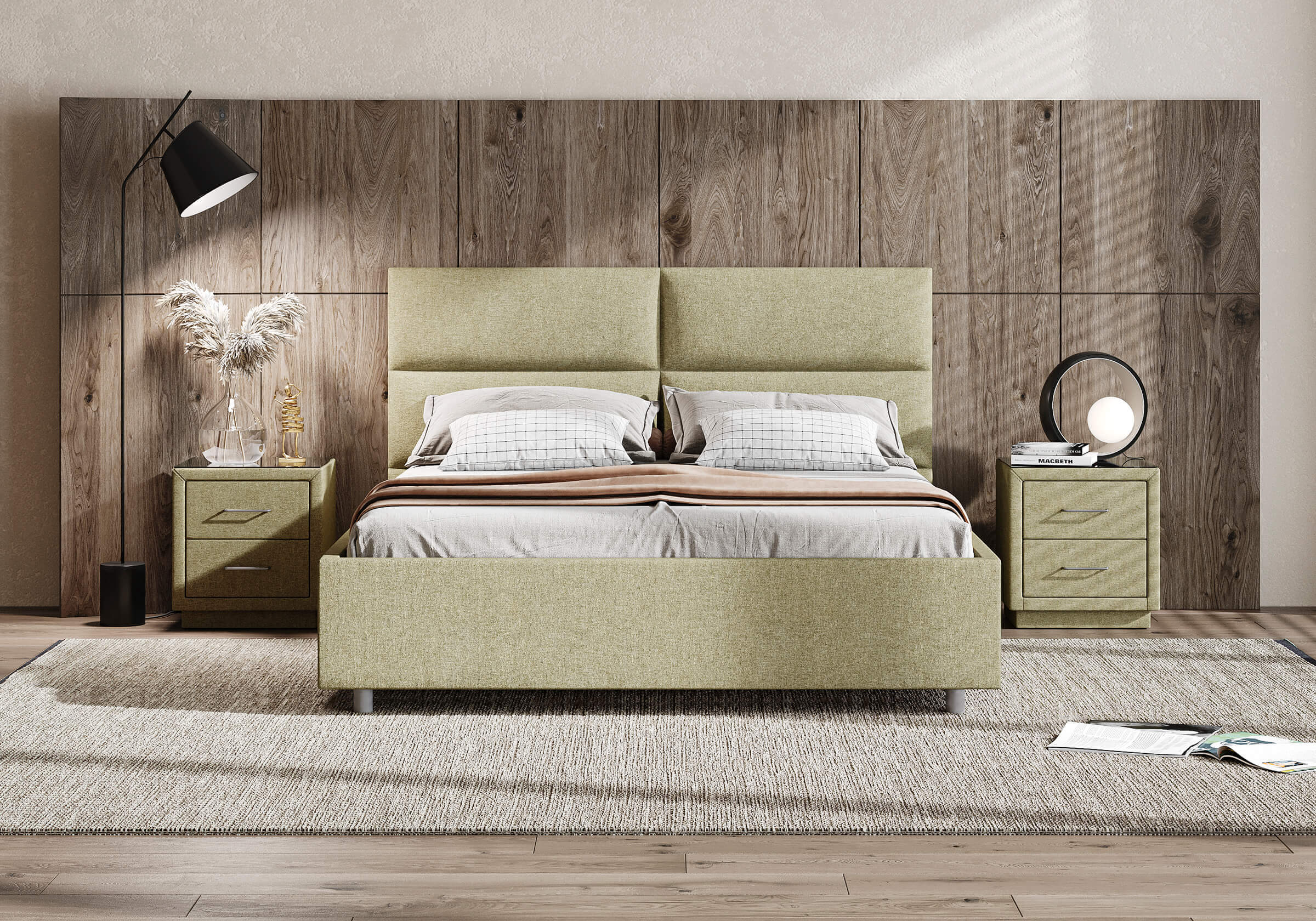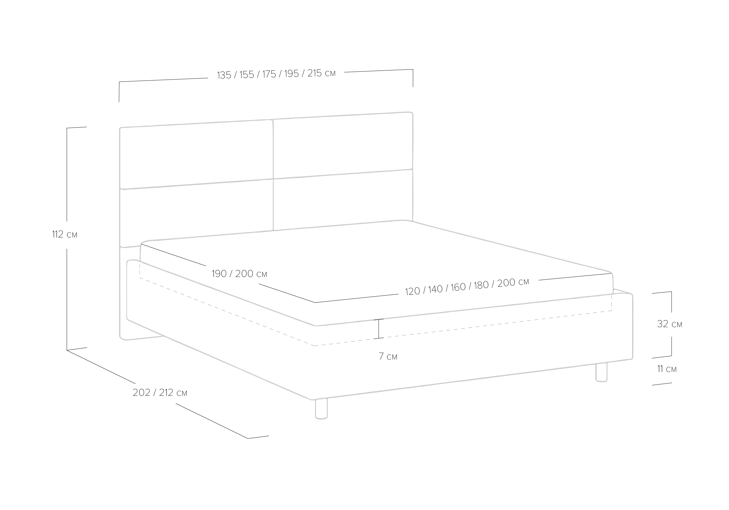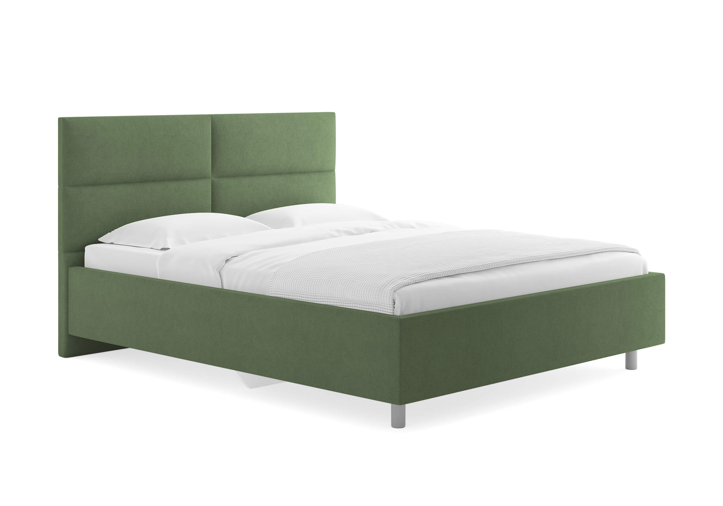 Лаконичная модель с изголовьем из объемных прямоугольников, сшитых между собой. Царги кровати выполняются по технологии съемного чехла. Модель изготовлена из ДСП. Обратная сторона изголовья обита спандбондом, но, при желании, её можно выполнить из основного обивочного материала. При необходимости кровать может быть укомплектована разборным или неразборным металлическим основанием с ламелями, подъемным механизмом с бельевым ящиком, трансформируемым основанием Aquarius.