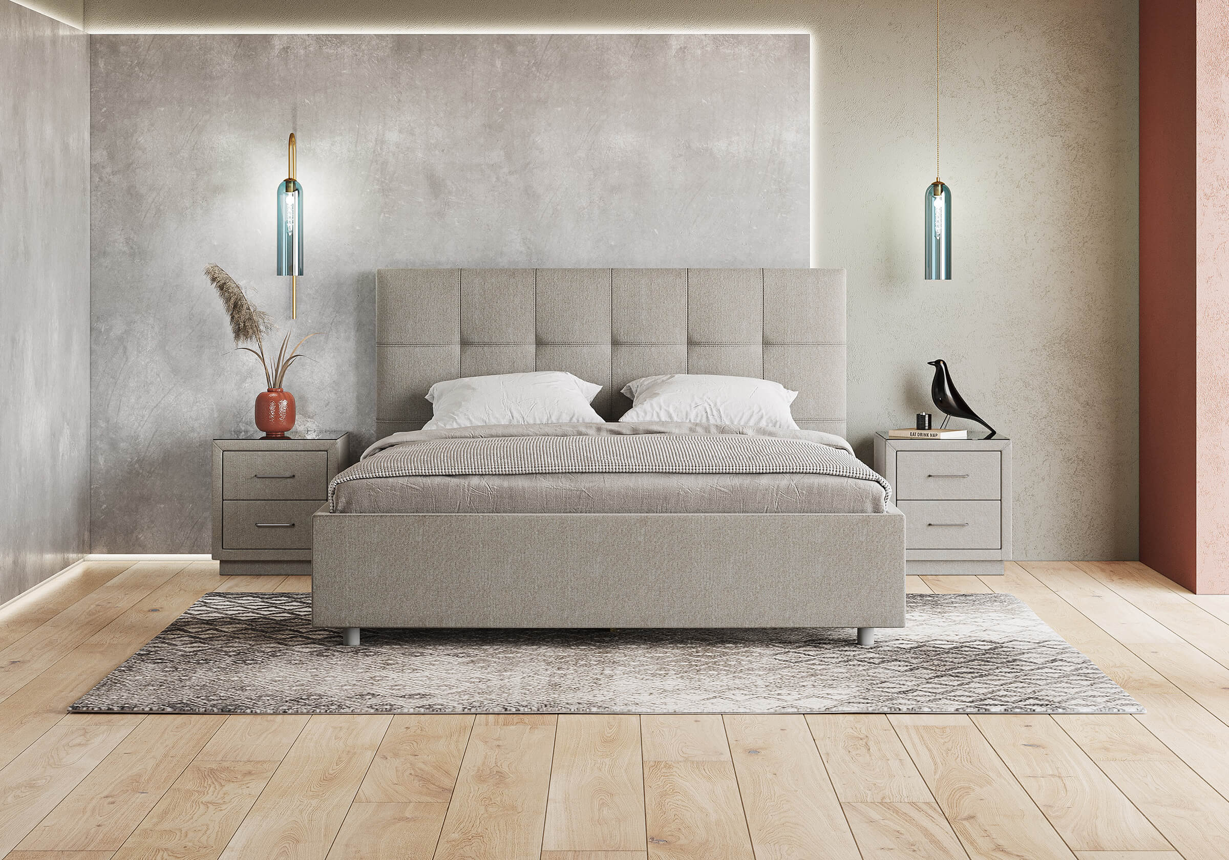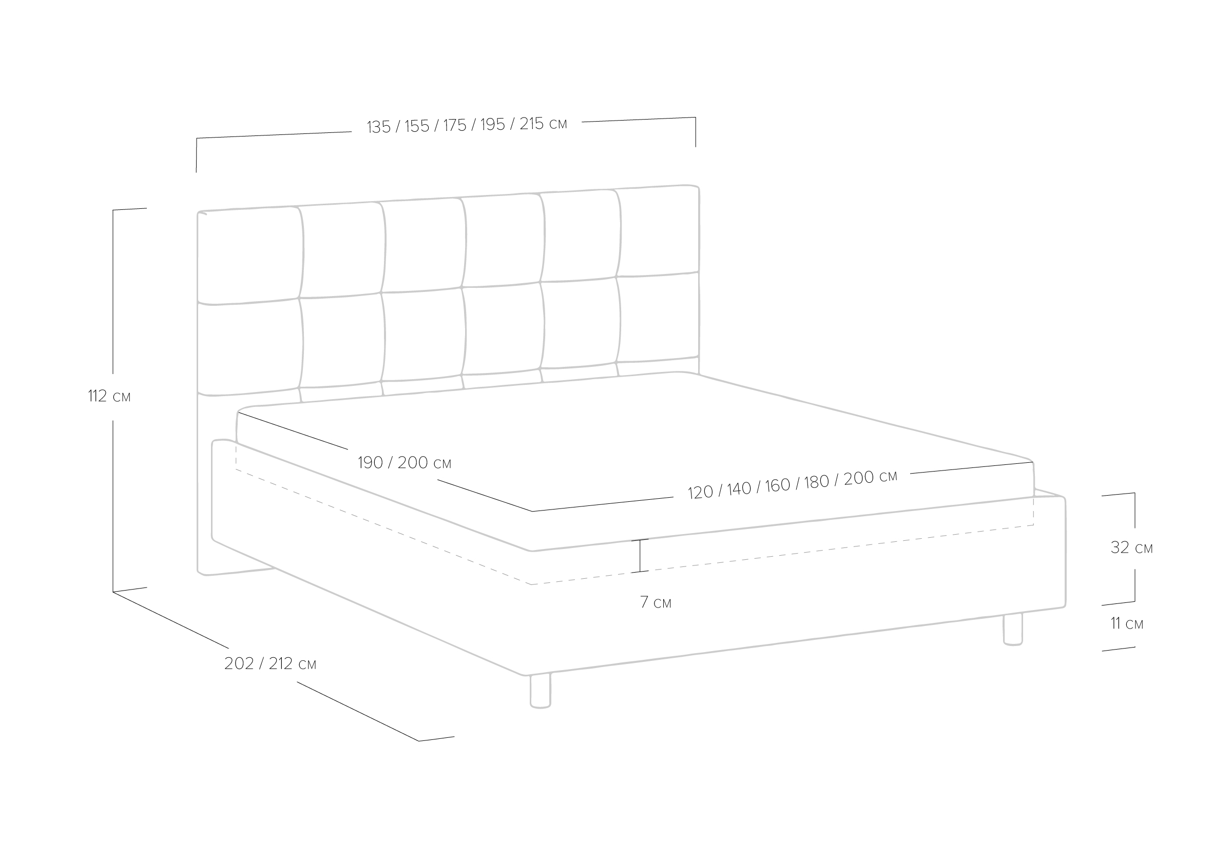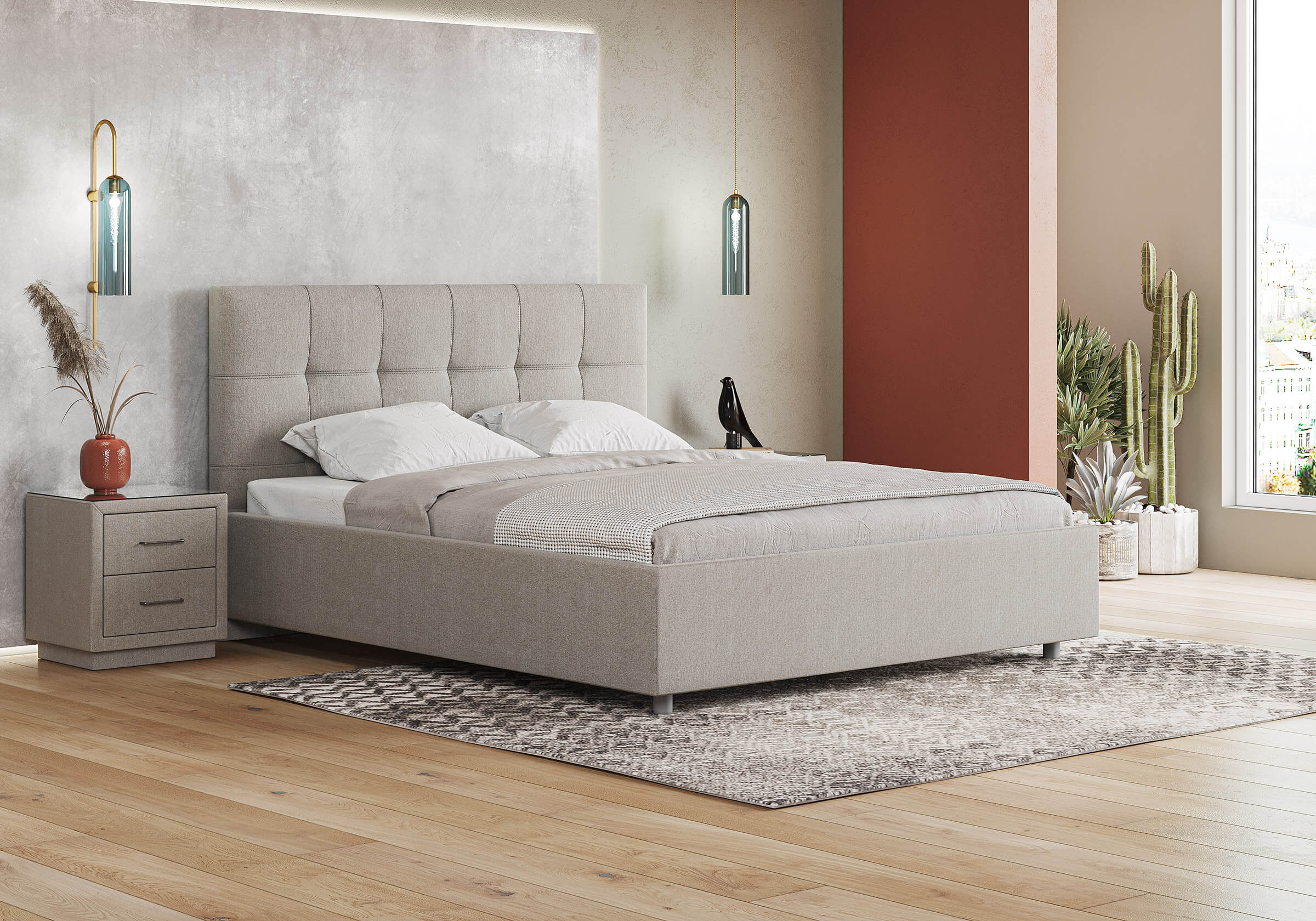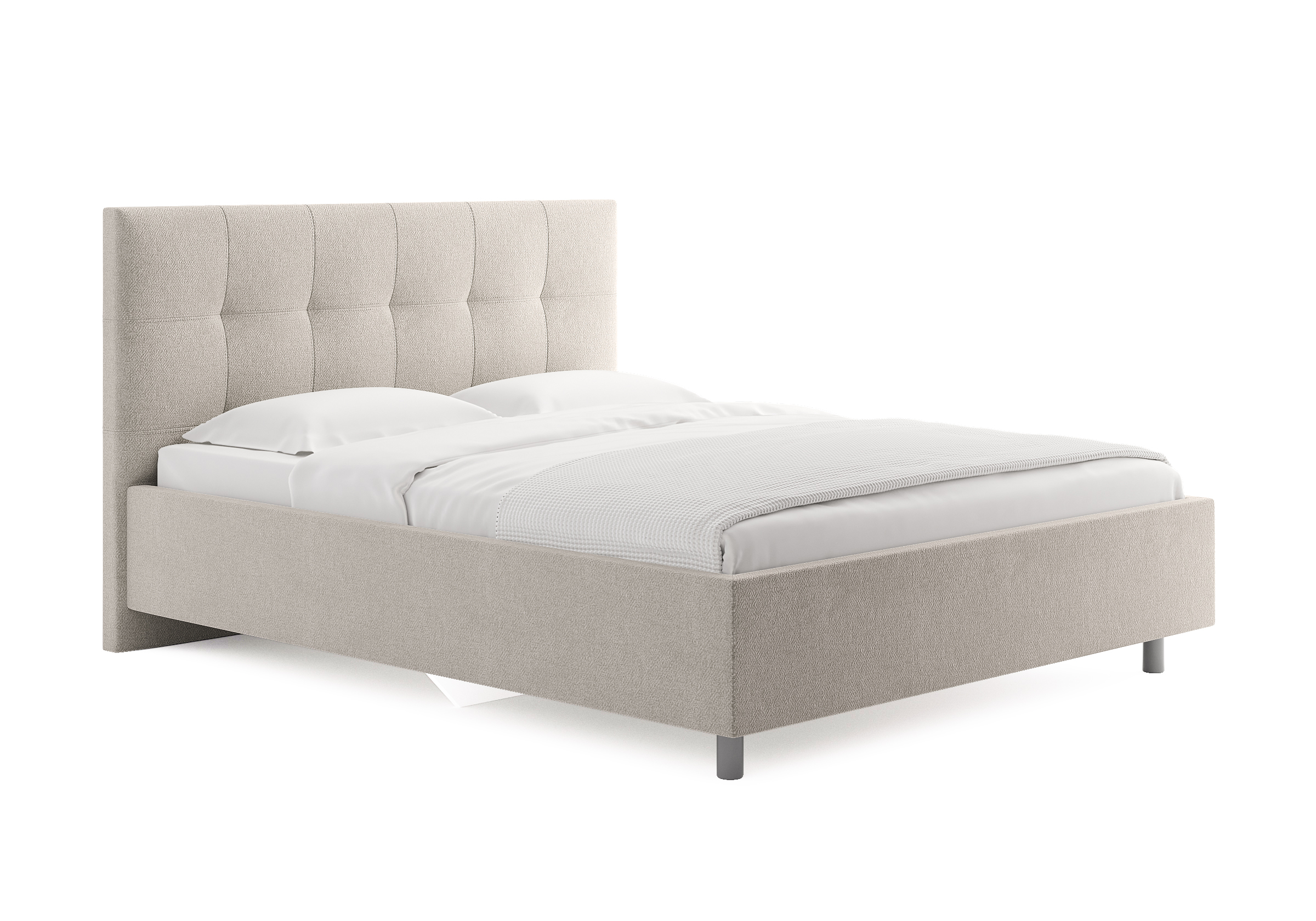 Лаконичная кровать с изголовьем, украшенным декоративной строчкой. Модель изготовлена из ДСП. Обратная сторона изголовья обита спандбондом, но её можно выполнить из основного обивочного материала. При необходимости кровать может быть укомплектована разборным или неразборным металлическим основанием с ламелями, подъемным механизмом с бельевым ящиком, трансформируемым основанием Aquarius.
