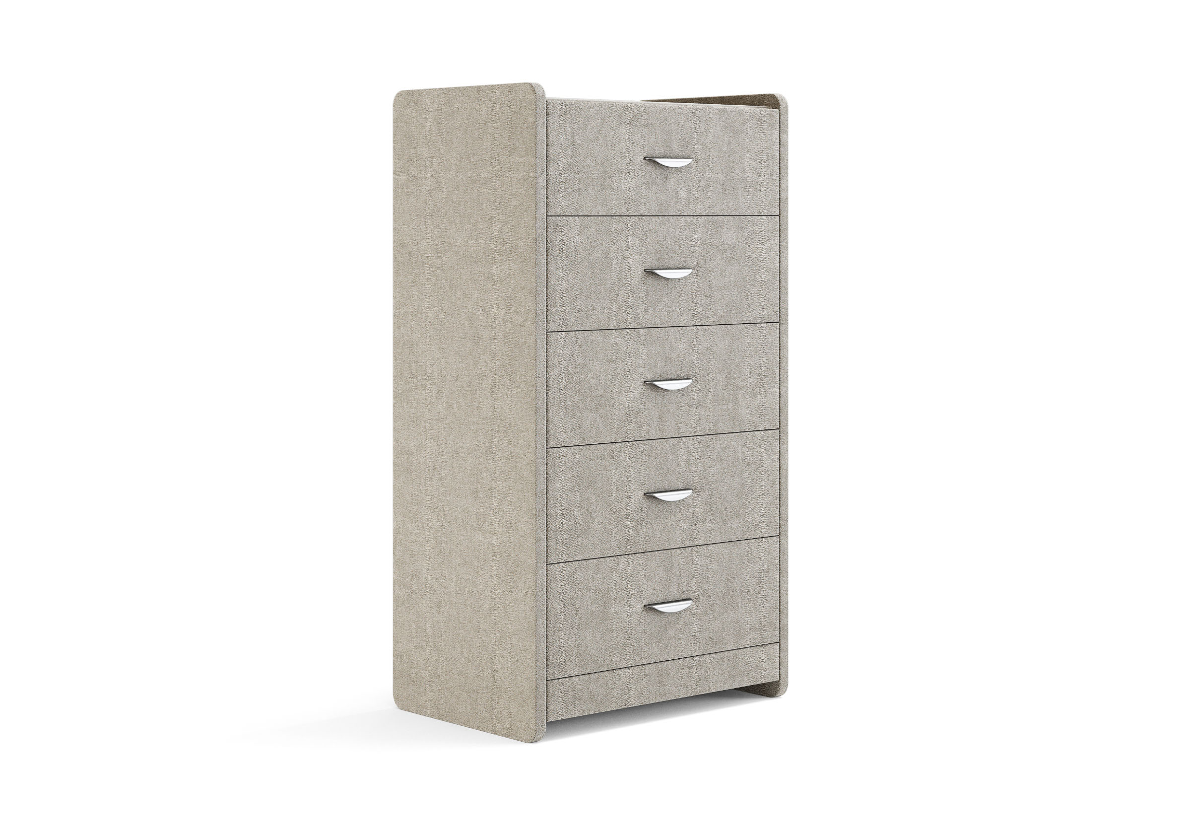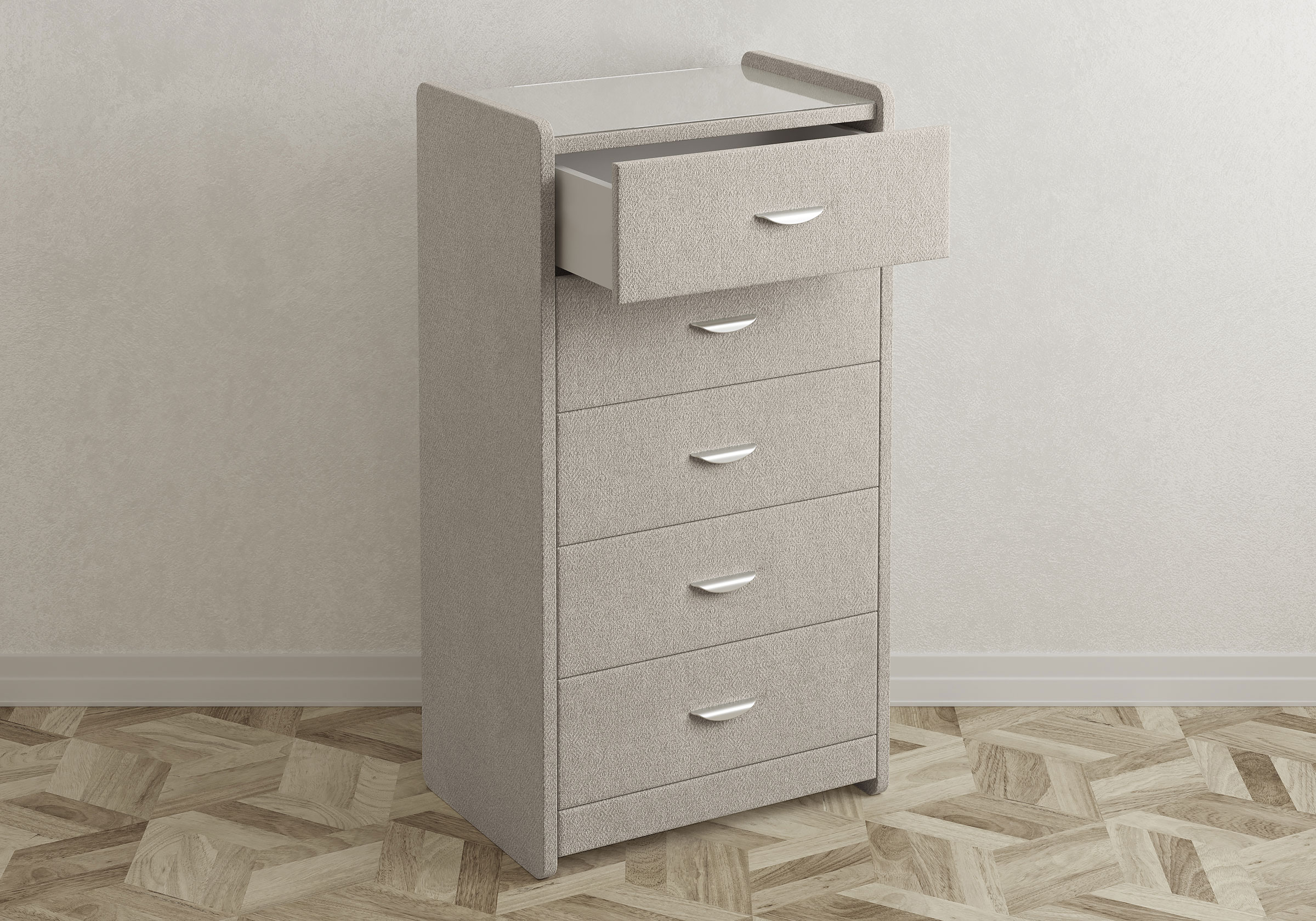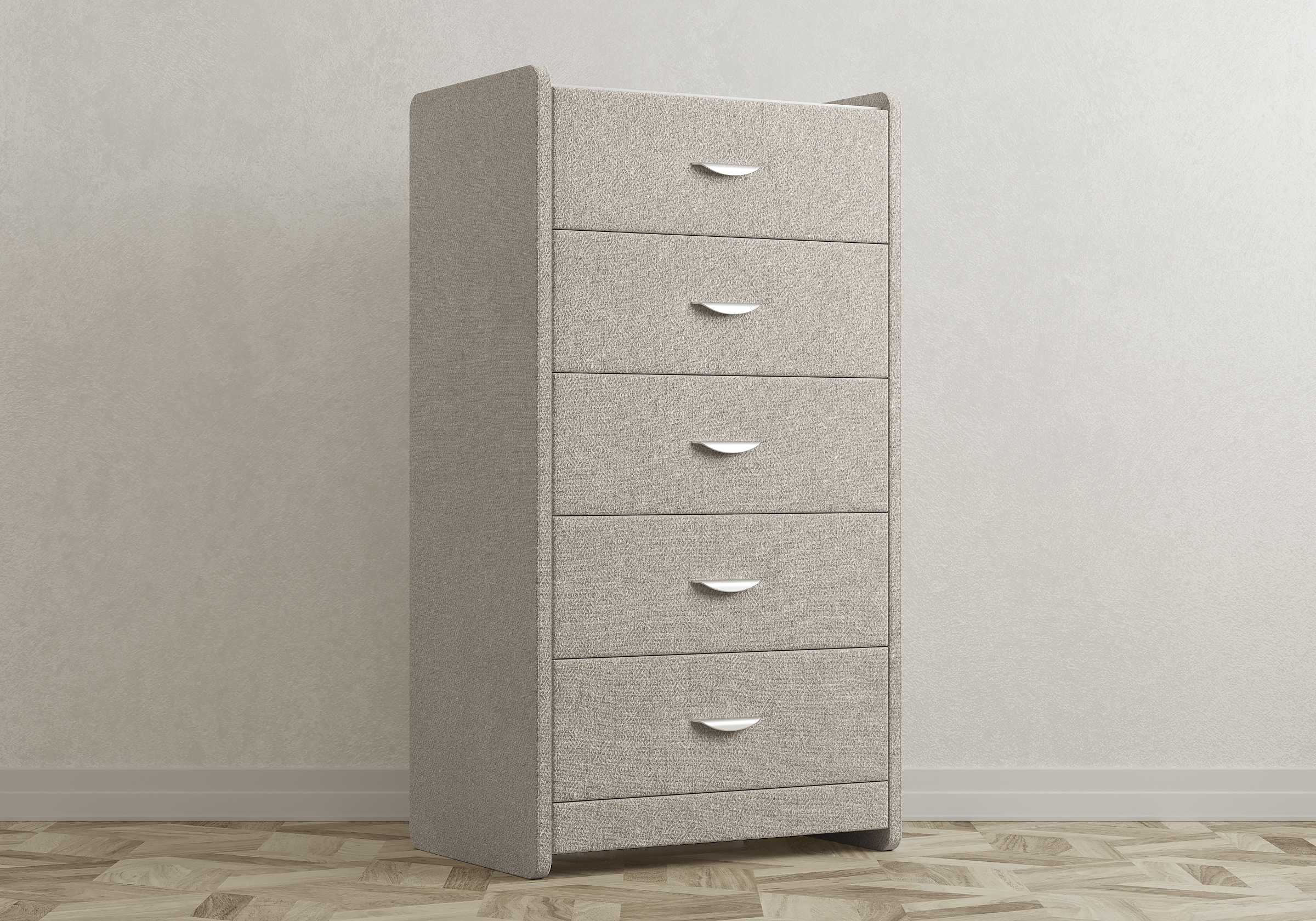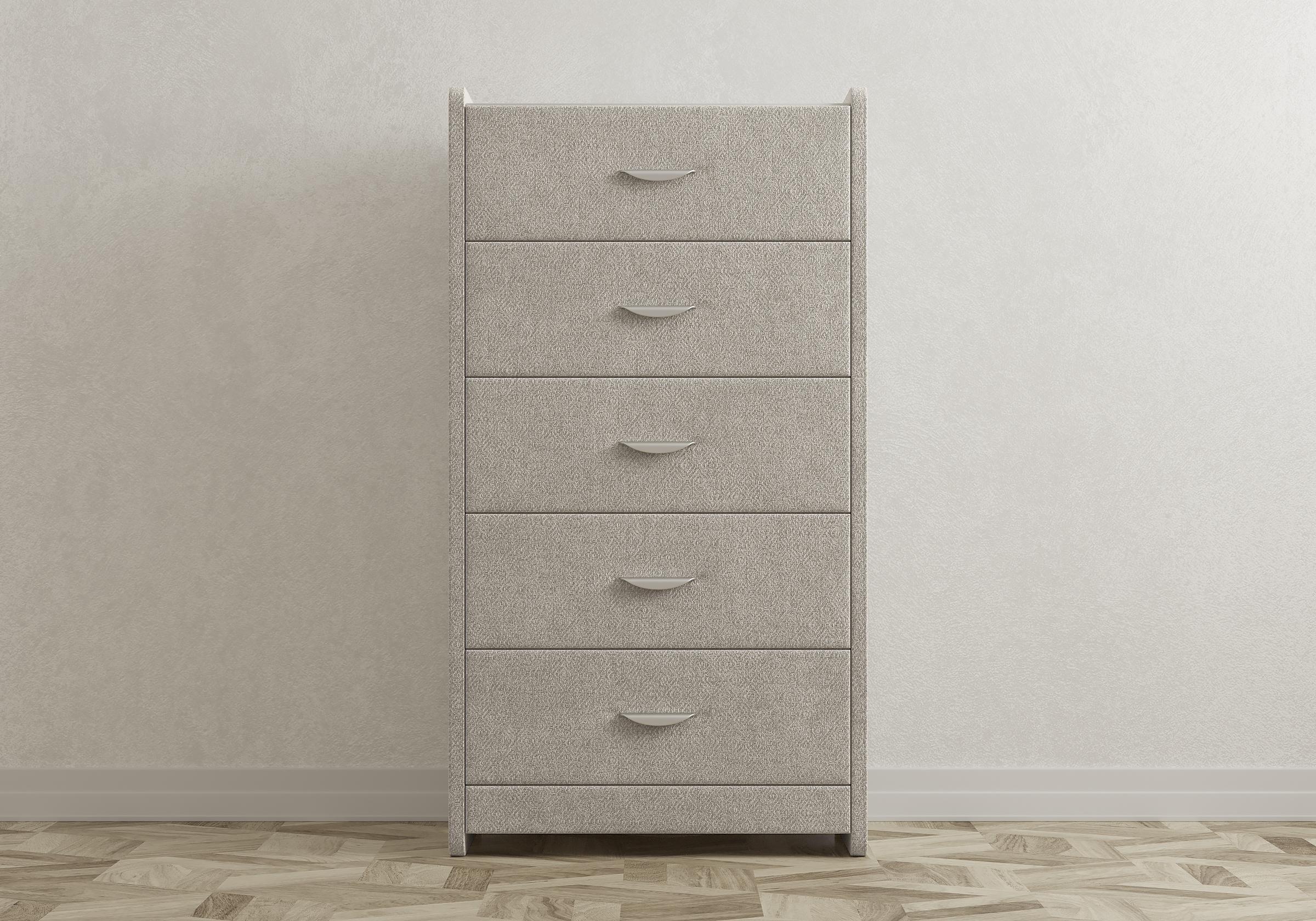 Комод с 5 ящиками сдержанного дизайна дополнит любой интерьер и сделает его более функциональным. Каркас комода и фасад ящиков покрыты обивочным материалом и выполняется в 43 вариантах цветового исполнения.