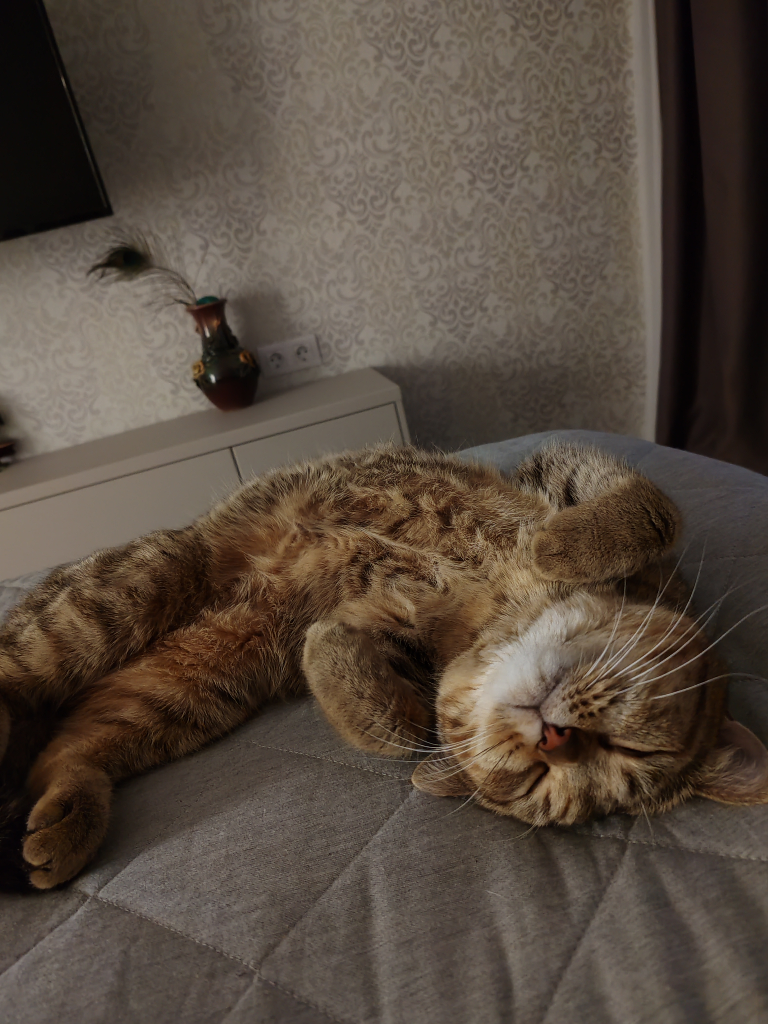 Серое покрывало с ромбиками. На кровати лежит ровно и красиво. Под мебель и шторы подошло просто идеально. Рекомендую.
